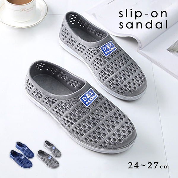 スリッポンサンダル スリッポン サンダル グレー ブルー ベランダ 海 プール メンズサンダル アウトドア デイリー使い 脚ムレ防止 メッシュ仕様 通気性抜群 ワンポイントロゴ シンプル 全2色