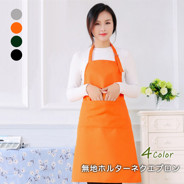 エプロン 無地 料理 作業 家事 掃除 主婦 撥水加工 ホルターネック 首紐長さ調節可能 フロントポケット 3ポケット 実用的 Aライン 美シルエット オレンジ ブラック ディープグリーン グレー