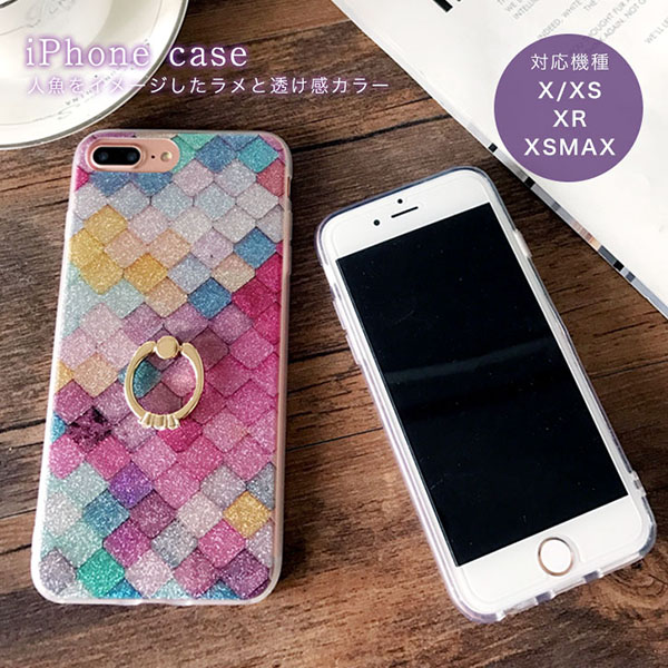 iPhoneケース アイフォン ケース カバー iPhoneカバー 携帯 iPhone 人魚風 人魚のウロコ風 ラメ キラキラ 虹色コントラスト リング付き 指輪風リング かわいい オシャレ 映える TPU
