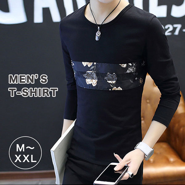メンズロンT 長袖シャツ 長袖 花柄デザイン 花 フラワー ロンT トップス かっこいい シンプル オシャレ 秋冬 春 ブラック ホワイト ブルー 選べるカラー おしゃれ 細身メンズ メンズファッション Uネック