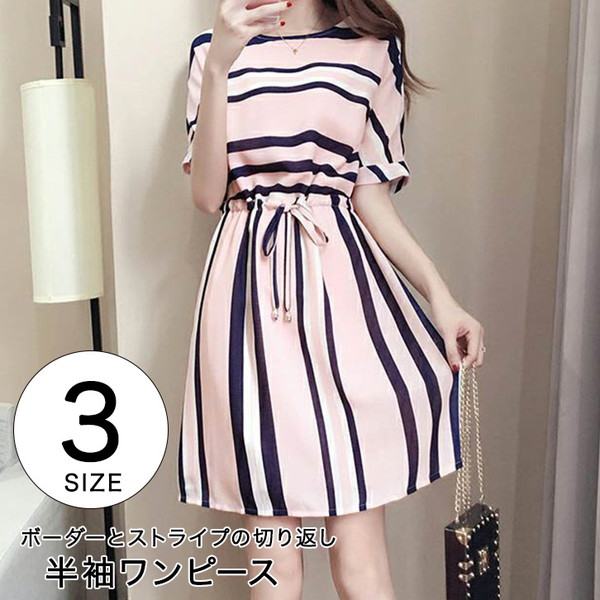 ワンピース 半袖 レディースワンピース レディース ワンピ レディースワンピ ボーダー ストライプ ミニ丈 膝上丈 ラクチン 通気性抜群 ルームウェア 柔軟 着痩せ効果 細魅せ 透けない ピンク 大人かわいい おしゃれ