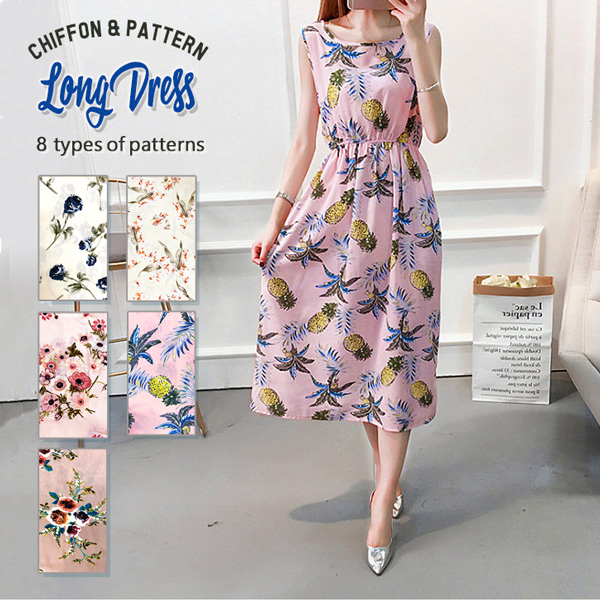 ワンピース シフォンワンピースワンピ 花柄 パイナップル トロピカル オシャレ リゾート らくちん 1枚で決まる かわいい ルームウェア ひざ下 ロング丈 ハイウエスト切り替え 透け感