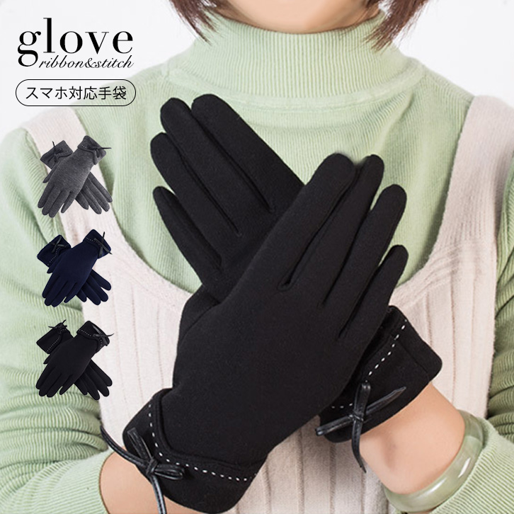 手袋 レディース リボン シンプル スマホ対応 スマートフォン操作可能 スマホ操作可能 フェミニン おしゃれ かわいい 細身ライン 裏起毛 あったか ふわふわ 防寒対策 ダークブルー ネイビー ブラック 全3カラー 上品