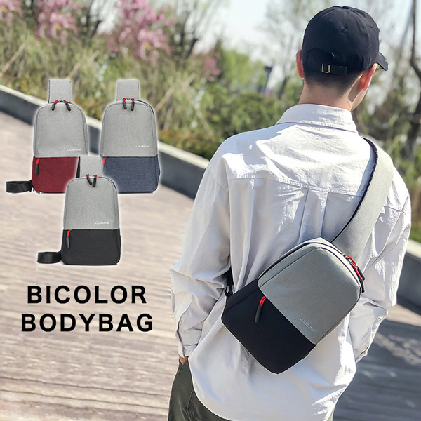 ボディバッグ シンプル バイカラー メンズ シンプル スタイリッシュ デイリー ショルダー紐長さ調節可能 フロントポケット ダブルジッパー開閉 通気性抜群 メッシュ素材 収納力抜群 機能性抜群 レッド ブルー ブラック