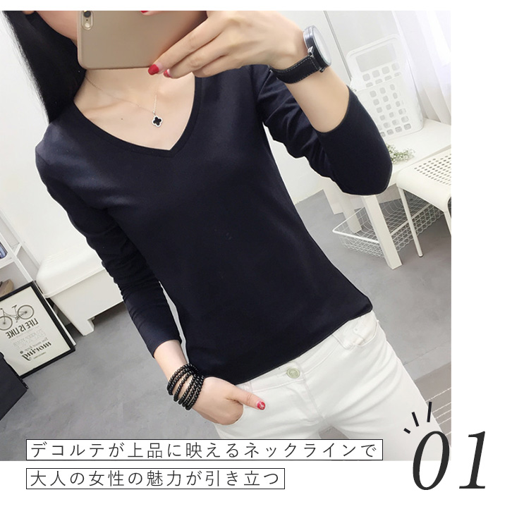 ロンT レディース 無地 長袖 ロングTシャツ Vネック シンプル 着回し力抜群 伸縮性 美デコルテ 大人可愛い 着心地抜群 インナー ブラック 黒 レディーストップス 長袖トップス Tシャツ シンプルシャツ 美シルエット