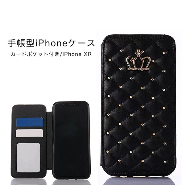 iPhoneケース iPhone 手帳型ケース 手帳型 アイフォン クラウン キルティング かわいい かっこいい おしゃれ iPhoneカバー カバー 画面保護 キズ防止 カードポケット iPhoneXR ブラック 黒