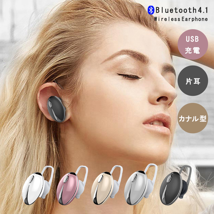 ワイヤレスイヤホン 片耳 カナル式 USB充電 Bluetoothイヤホン Bluetooth4.1対応 Bluetooth 小型 軽量 快適 負担軽減 多機能 ワンボタン操作 簡単 機能性抜群 高音質 カラー豊富 5カラー シルバー ゴールド ローズゴールド ホワイト ブラック