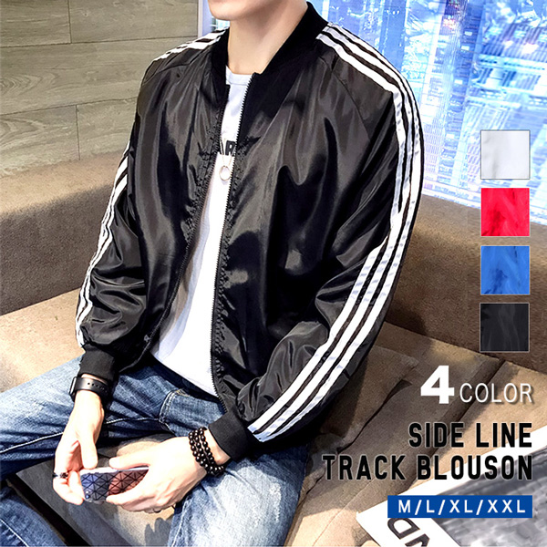ブルゾン メンズ ジャケット サイドライン おしゃれ シンプル 着回し抜群 スポーティー カジュアル 全4カラー カラー豊富 ジャージ風 サイズ豊富 薄手 軽い着心地 ユニセックス ホワイト ブラック ブルー レッド