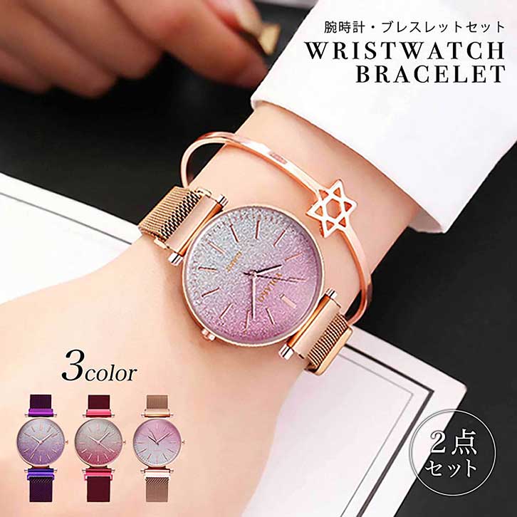 腕時計 レディース ウォッチ レディースウォッチ ブレスレット セット 2点セット アクセント かわいい 上品 大人かわいい きれいめ グラデーション ラメ ゴージャス マグネット式 メッシュベルト 全3カラー ゴールド レッド パープル