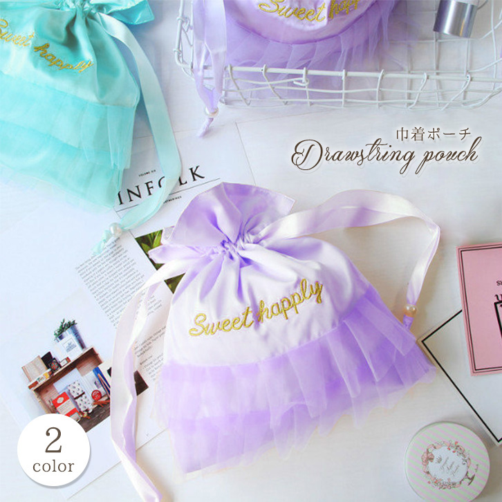 巾着袋 巾着ポーチ ポーチ 小物 メイクポーチ 化粧ポーチ コスメポーチ サニタリーポーチ マルチ巾着ポーチ かわいい 刺繍 チュール素材 巾着 フリル キュート 可愛い おしゃれ 全2カラー 薄紫 水色 オシャレ