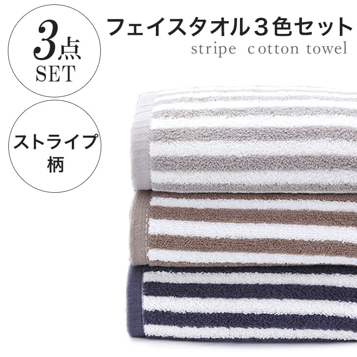 タオル 3枚セット フェイスタオル 3色セット ストライプ 縞柄 洗顔用 お得な3枚セット コットン