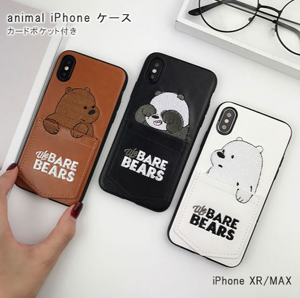 iPhoneケース iPhone ケース かわいい アイフォン アニマル 動物 クマ シロクマ パンダ ベア テディベア ブラウン ホワイト ブラック ポケット付き 可愛い 癒し ポケット カードポケット アニマル刺繍