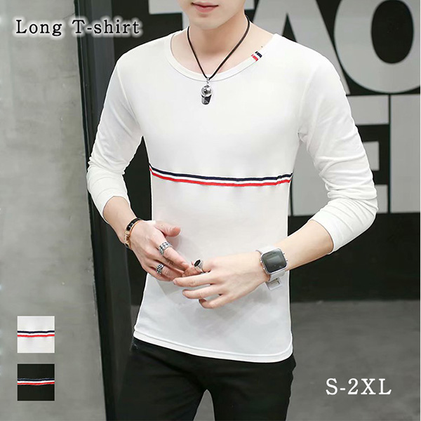 メンズロングTシャツ ロンT シンプル 長袖 メンズシャツ シンプル 合わせやすい インナーシャツ Uネック ラインTシャツ 3本ライン 着心地抜群 伸縮性抜群 さらさら素材 全2色 ホワイト ブラック