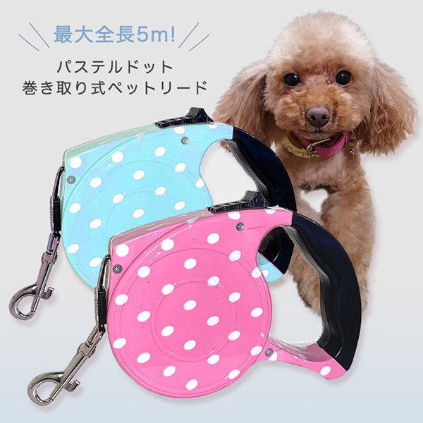 リード ペットリード ドット柄 巻き取り式 巻き取り お散歩 お出かけ ペット用品 ペットリード 犬用リード 最大全長5メートル かわいい ドット 水玉 パステルカラー お散歩リード ロック機能 持ちやすい フィットグリップ
