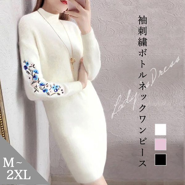 ワンピース レディース ワンピ レディースワンピ 膝上丈 ミニ丈 長袖 秋 冬 春 刺繍 花柄 花柄刺繍 ボトルネック フリース素材 あったかい 暖かい リブ袖 リブ裾 リブ 着心地抜群 やわらか フリース 大人かわいい きれいめ