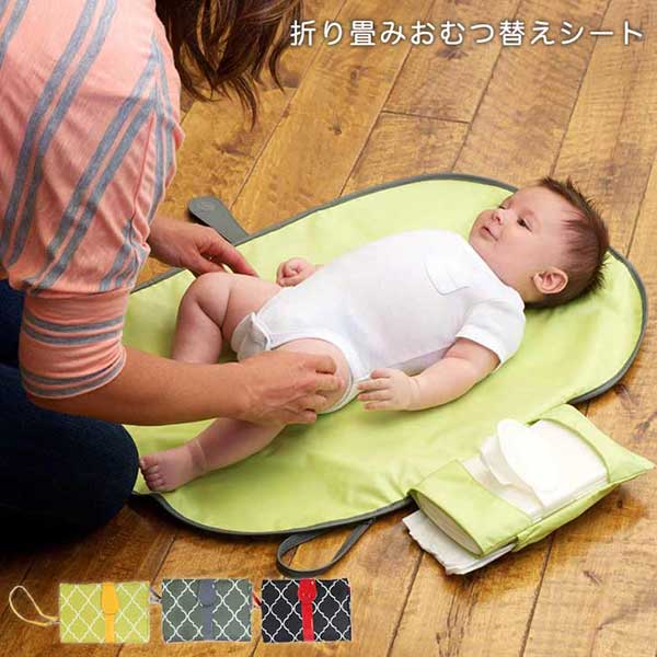 おむつ替えシート おむつ替えマット ベビー ティッシュポケット付き 機能的 おりたたみコンパクト収納 小さく折りたためる 持ち運び便利 グリーン グレー ブラック 選べるカラー ストラップ付き 赤ちゃん 収納ポケット 携帯用