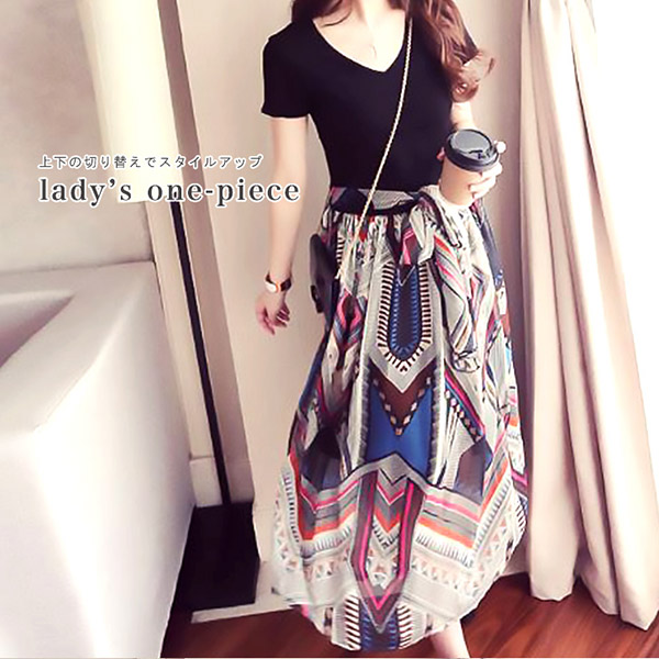 レディースワンピ ワンピース Aライン ハイウエスト バイカラー 切り替え ワンピ ロングスカート ペイズリー 夏 普段着 シフォンワンピ 半袖Vネック おしゃれ エスニック柄 ボヘミアン風 大人可愛い
