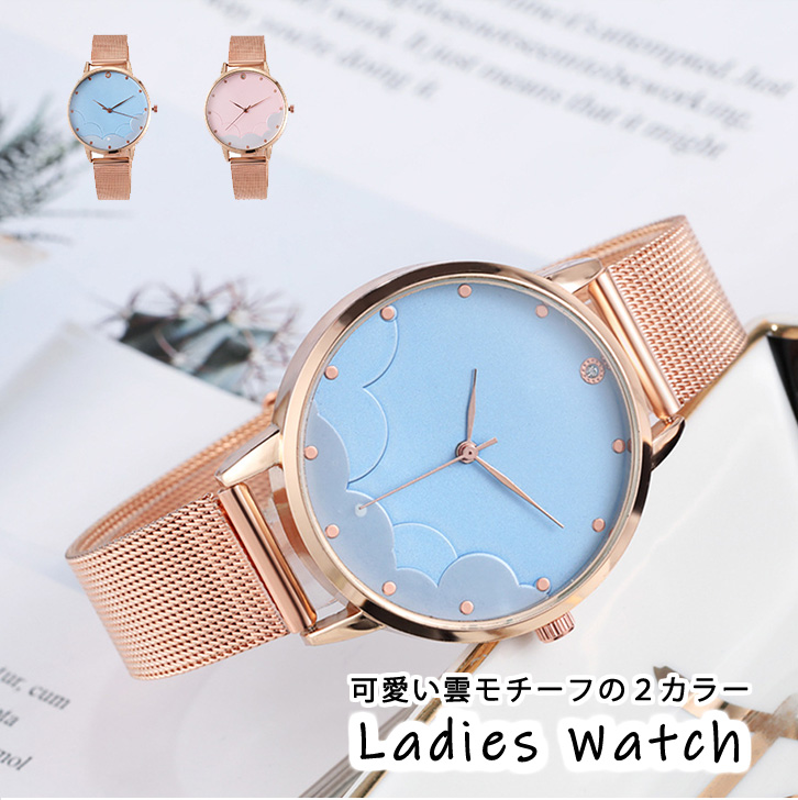 腕時計 レディース レディース腕時計 レディースウォッチ ウォッチ 女性 ブルー ピンク ストーン ラインストーン シンプル 雲 おしゃれ 可愛い メッシュベルト ピンクゴールド デイリー カジュアル オフィスカジュアル かわいい
