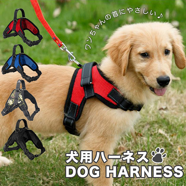 ハーネス 犬用 ドッグハーネス ペット用品 小型犬 中型犬 大型犬 犬用ハーネス 散歩 お出かけ サイズ調節可能 着脱簡単 通気性抜群 メッシュ素材 首にやさしい 胴輪 ペット レッド ブルー ブラック 迷彩 全4タイプ