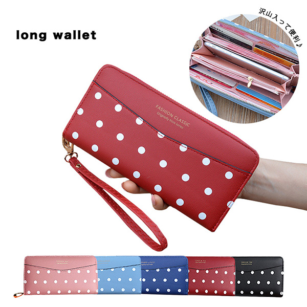 財布 レディース 長財布 ロングウォレット 水玉 カラー豊富 収納力抜群 かわいい ポップ ドット柄 ジッパー開閉 ストラップ付き キュート 水玉財布 ピンク レッド ブラック ライトブルー ブルー 全5色 5カラー カラバリ