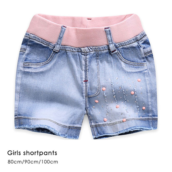キッズショートパンツ 女の子 ショートパンツ ガールズ 女児 デニム風ショートパンツ 伸縮性抜群 履きやすい ベルトループあり ラインストーン付き ダメージ加工 オシャレ かわいい かっこいい