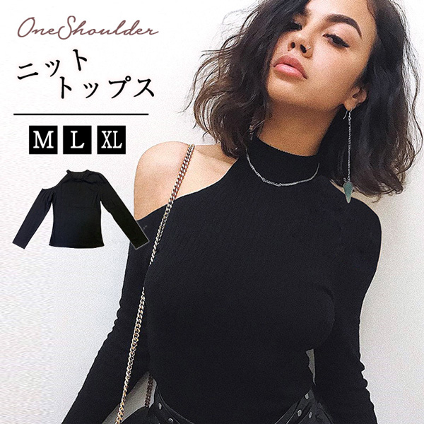 ニット レディース ワンショルダー トップス 長袖 おしゃれ アーバンカジュアル ブラック リブニット素材 着心地抜群 肌触り抜群 伸縮性 トレンド ワンショル 肩出し 肩見せ セクシー 大人カッコイイ 黒 きれいめ 無地