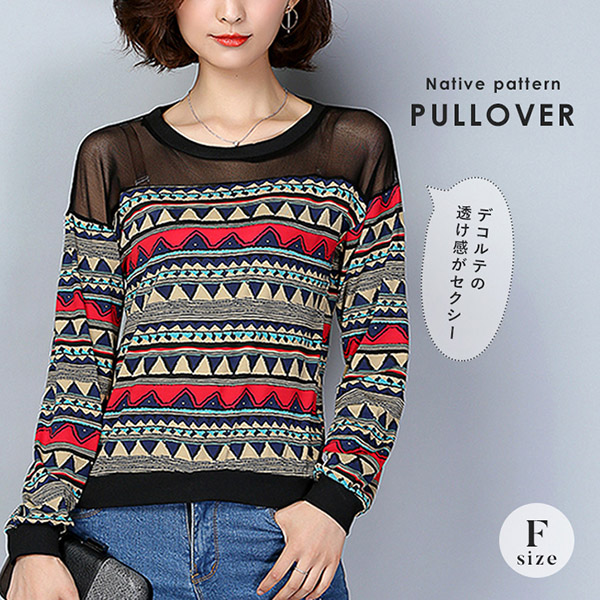 トップス レディース 長袖 プルオーバー 透け感 ネイティブ デコルテ魅せ フリーサイズ セクシー プルオーバートップス 着回し力 さらっとした肌触り 着心地抜群 オールシーズン レトロ レディーストップス 個性的