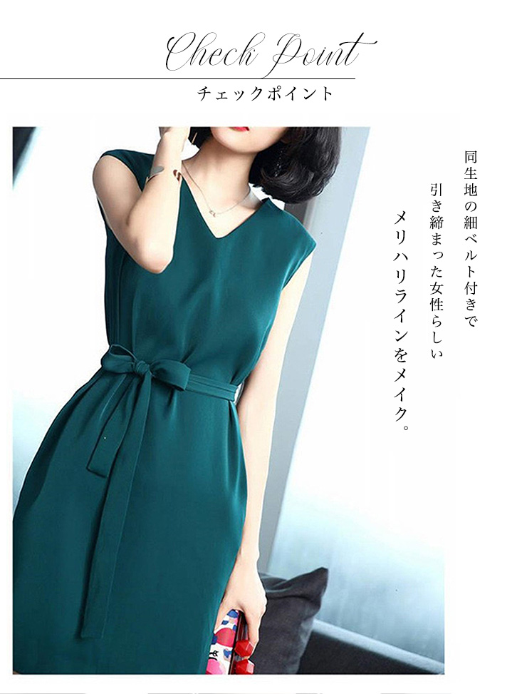 ワンピース レディース 膝上丈 ミニ丈 ノースリーブ Vネック ノースリーブワンピース きれいめ 上品 エレガント 無地 シンプル 美シルエット 美デコルテ 大人かわいい ウエストリボン 細魅せ グリーン ブラック 綺麗め