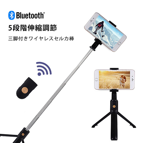 三脚付きワイヤレスセルカ棒 自撮り棒 自撮り用 カメラスタンド セルカ棒 三脚 Bluetooth三脚 スマホ三脚 分離式シャッター 取り外しシャッター iphone対応 アンドロイド対応 リモコン 遠隔 遠隔シャッター 軽量 折りたたみ式