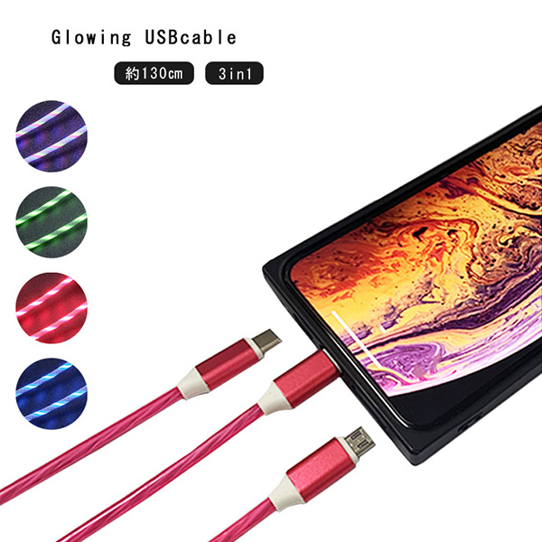 ケーブル 充電ケーブル USBケーブル 光る 光るケーブル 3in1 Type-C iPhone iPad microUSB アンドロイド スマートフォン 充電 暗闇で光る 全4カラー 長さ130cm 絡まりにくい 柔軟性抜群 耐久性 断線しにくい
