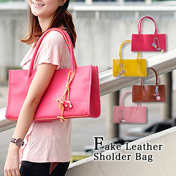 バッグ ショルダーバッグ トートバッグ ハンドバッグ フェイクレザー 合皮レザー PUレザー 全4色 シンプル 無地 デイリー使い 通勤 通学 長めハンドル 軽量 使いやすい フラワーチャーム