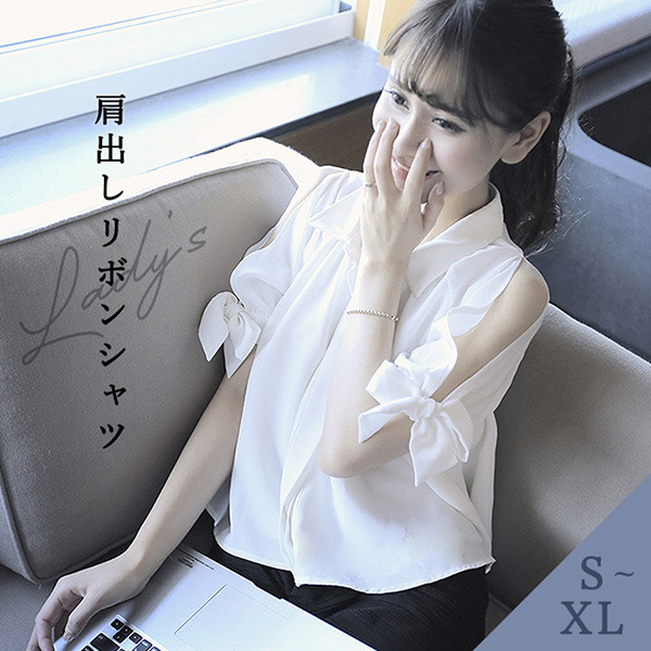 シャツ ブラウス レディース 半袖 肩出し リボンシャツ 肩出しリボンシャツ ホワイト 綺麗め 大人かわいい 着回し抜群 合わせやすい 肩開き リボン シンプル 無地 着心地抜群 サラサラ 快適 可愛い おしゃれ きれいめ