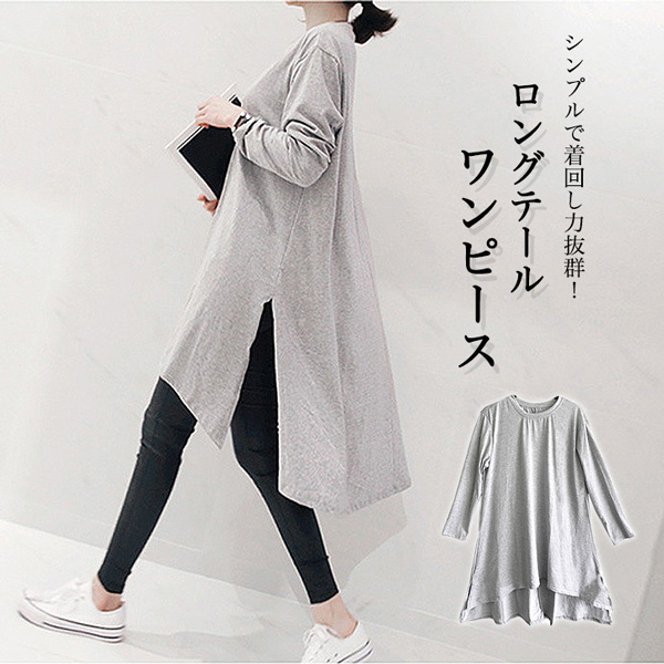 レディース ワンピース ロング テール 長袖 ワンピ ロングテール グレー 楽ちん シンプル かわいい ストリートファッション ビッグシルエット 体型カバー