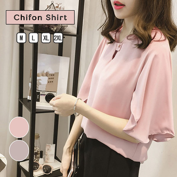 トップス レディース 5分袖 シフォン シャツ ブラウス シフォンシャツ フェミニン カジュアル オフィス 通勤 きれいめ 体型カバー 美デコルテ シワになりにくい シフォン生地 フレアスリーブ 二の腕カバー ピンク グレー