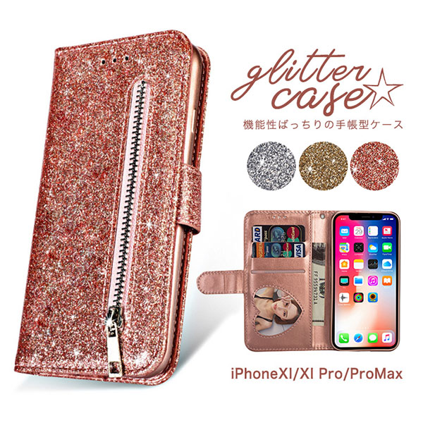 iPhoneケース 手帳型ケース 手帳型 アイフォン カバー iPhone11 iPhone11Pro iPhone11ProMAX 機能性抜群 グリッターケース キラキラ 収納ポケット ジッパー収納 カード収納 スタンド機能 ストラップ付き