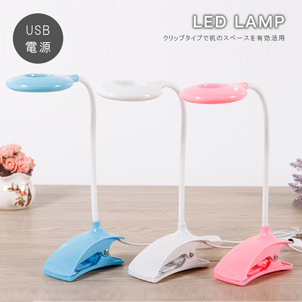 LEDライト 卓上ライト LEDランプ クリップタイプ USB接続 リング状ライト 曲線デザイン 角度調節可能 ブルー ホワイト ピンク