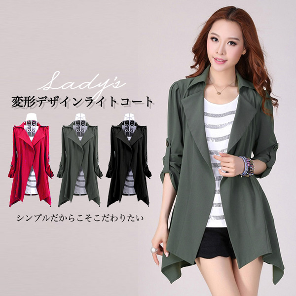 コート レディースコート 羽織り ライトコート 変形デザイン シンプル 無地 オシャレ 個性的 ボタンレス ロールアップボタン付き 秋 春 薄手 サイズ豊富 レッド モスグリーン ブラック 全3色 両サイドポケット付き 合わせやすい