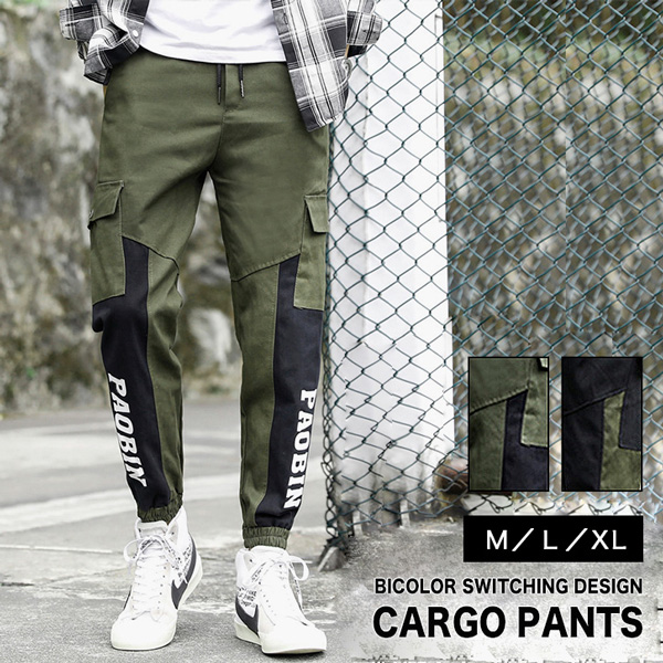 カーゴパンツ メンズ バイカラーデザイン ウエストゴム 紐調節 履き心地抜群 カーキー ブラック カジュアル アウトドア ロングパンツ 両サイドポケット ジョガータイプ すっきりシルエット 切り替えデザインカーゴパンツ