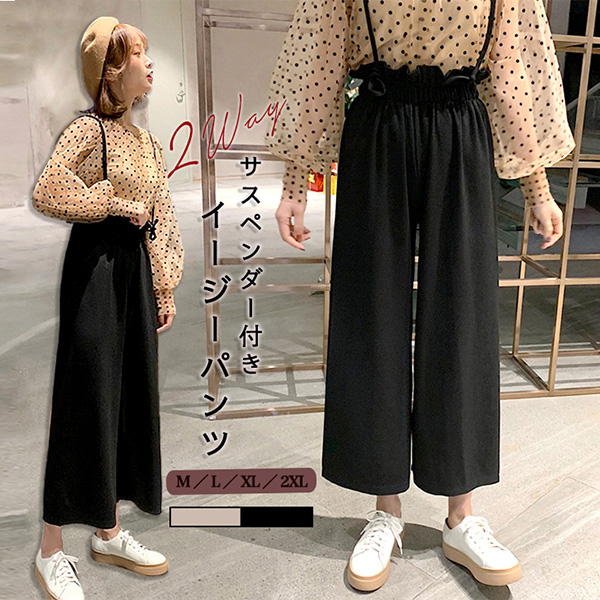 イージーパンツ レディース ボトムス パンツ レディースボトム レディースパンツ サスペンダー付き サス付きイージーパンツ トレンド 長さ調節可能 ウエストゴム らくちん リブ素材 伸縮性抜群 動きやすい アイボリー ブラック