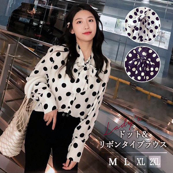 ブラウス レディース 長袖 秋 春 ドット リボンタイ おしゃれ 薄手 とろみ素材 着心地抜群 フリルブラウス 肌馴染み抜群 上品 おしゃれ きれいめ パフスリーブ 二の腕カバー ホワイト ブラック 全2色 モノトーン