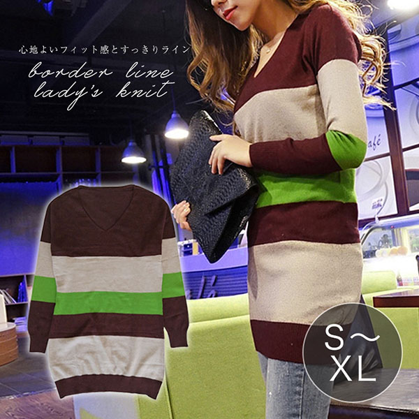 ニット セーター レディースニット レディースセーター 薄手 ボーダー ボーダーライン カジュアル グリーン Vネック 美シルエット リブ袖 細魅せ インナー 秋 冬 春 大人カジュアル デイリー あったか シンプル サイズ豊富