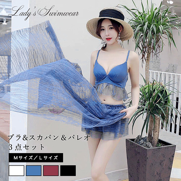 水着 レディース水着 スイムウェア ビキニ スカパン パレオ 3点セット おしゃれ 可愛い 大人かわいい 海 プール フリル 女子力アップ 盛れる バストアップ 速乾素材 着心地抜群 ホワイト ワイン ラベンダーブルー ブラック