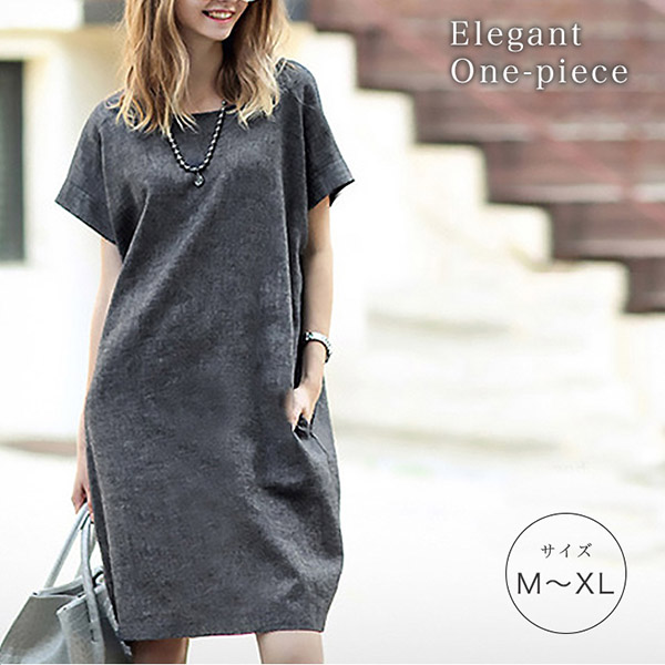 レディースワンピ ワンピース グレー 半袖 夏用 半袖ワンピ レディース 女性 肌触り抜群 コットンリネン 着心地抜群 シンプル 無地 コットン シンプルワンピ おしゃれ 着やせ効果 ウエストリボン付き