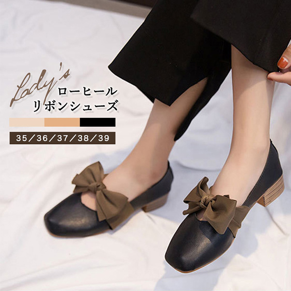 パンプス レディース 靴 シューズ リボンパンプス リボンシューズ ローヒール 女性 上品 大人かわいい おしゃれ かわいい合皮レザー 安定感 ウッド調ヒール レトロ クラシカル キュート 大きめリボン アイボリー ベージュ ブラック ヒール歩きやすい