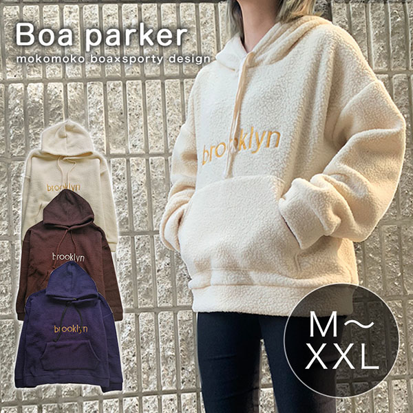 パーカー ボアパーカー レディース プルオーバー あったか 防寒 冬 ボア もこもこ ボア素材 フード付き ワンポイント スポーティー トレンド かわいい キュート 前ポケット付き 裏起毛 あったかい おしゃれ 可愛い アイボリー ブラウン ネイビー