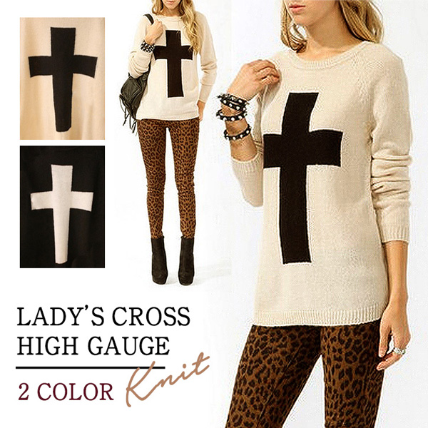 ニット レディースニット 長袖 クロスハイゲージニット シンプル クルーネック おしゃれ モード系 カジュアル クロスモチーフ アクセント 体型カバー ブラック ホワイト 着回し抜群 合わせやすい オシャレ 大人かっこいい モード