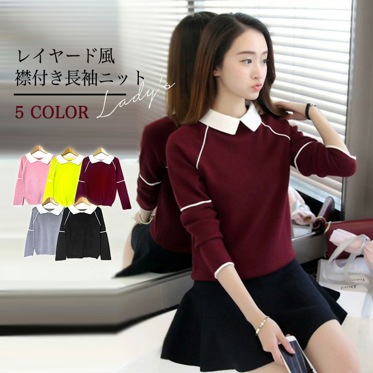 ニット レディース トップス 長袖 レディースニット 襟付き バイカラー ハイゲージニット 清潔感 かわいい シンプル カラー豊富 カラーバリエーション 全5色 全5カラー ピンク イエロー ワインレッド グレー ブラック