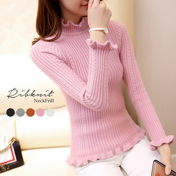 トップス 長袖 レディース ニット リブニット フリル かわいい おしゃれ 大人かわいい キュート 着回し抜群 フェミニン トレンド 美シルエット 女子力 カラー豊富 カラバリ 全5色 ワンサイズ キャラメル ピンク ホワイト グレー ブラック
