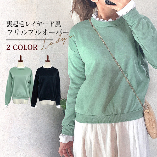 プルオーバー トレーナー 長袖 フリルプルオーバー 裏起毛 レイヤード風 重ね着風 かわいい おしゃれ 大人かわいい あったか 秋 冬 大人カジュアル デイリー 無地 シンプル グリーン ブラック ワンサイズ お洒落