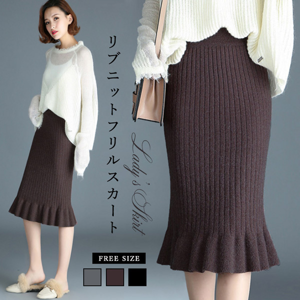 スカート レディーススカート 膝下丈 ミモレ丈 リブニットスカート フリルスカート 美シルエット タイトスカート リブニットフリルスカート きれいめ おしゃれ シンプル シンプル 上品 ニットスカート 着やせ 伸縮性抜群 らくちん